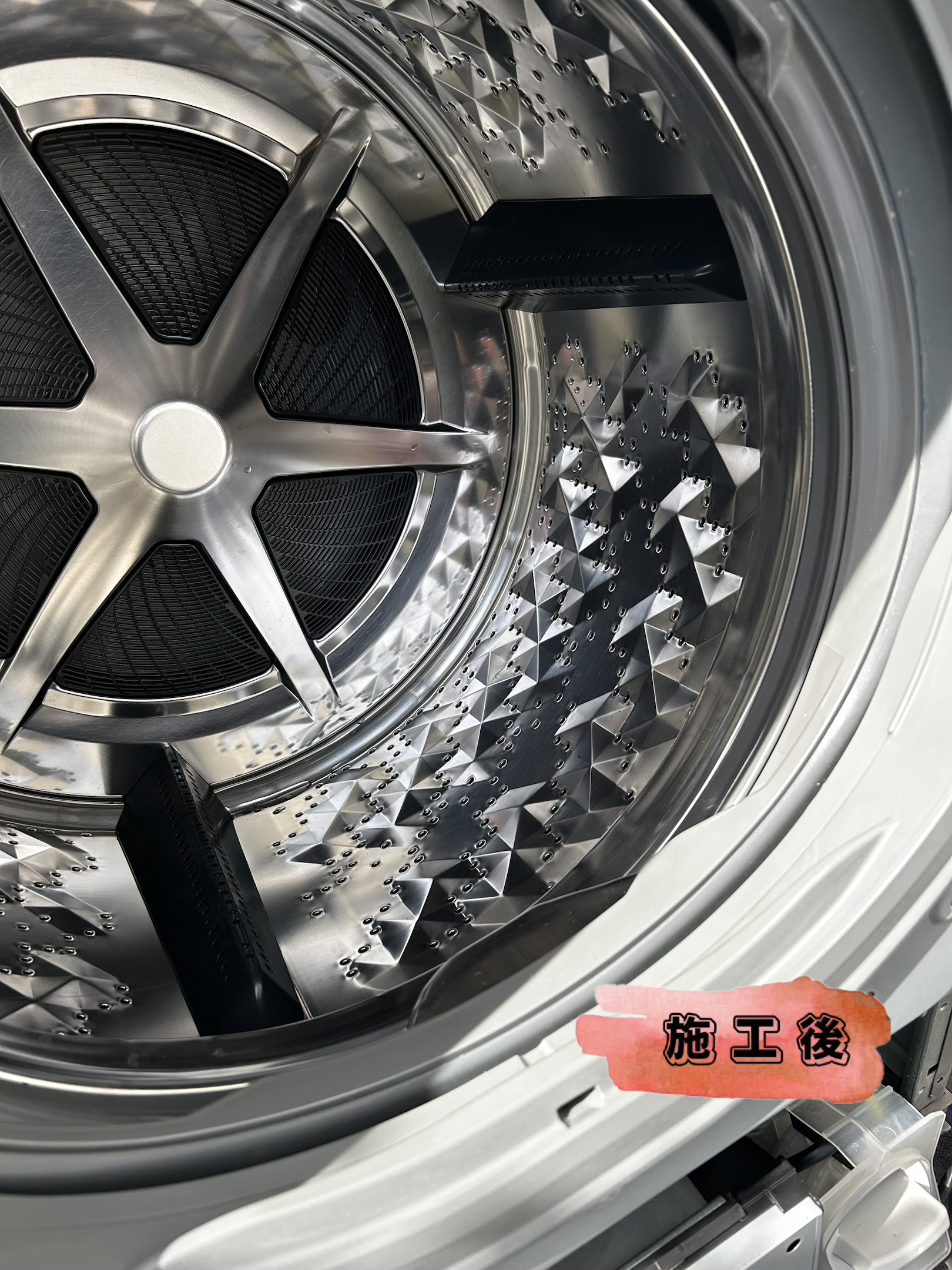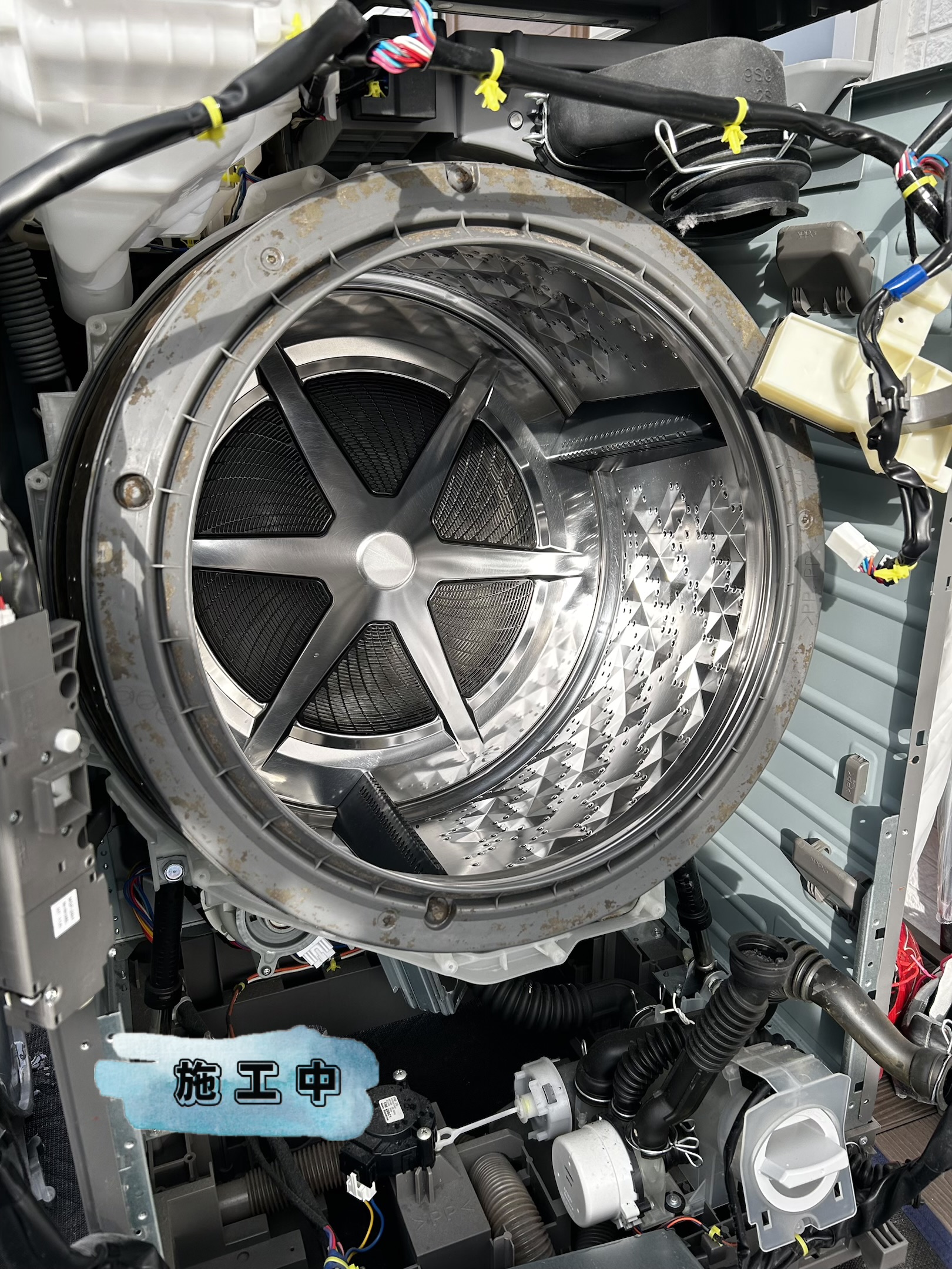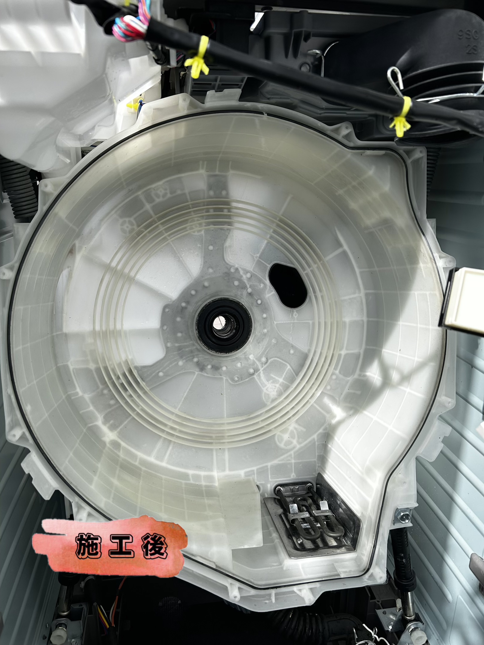 柔軟剤を入れているのに、生乾きのような臭いがしているとのことで、分解クリーニングを施工させて頂きました。 洗濯槽はもちろん、外殻や内部ヒーター部にも苔状汚れがびっしりでした。専用洗剤と高圧洗浄機により、キレイに。この機会に、ベローズ(ドアパッキン)も交換させて頂きました。
